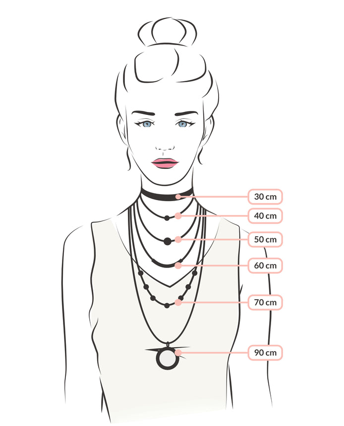 En joyería se distingue entre longitudes de collar de entre 30 cm y 90 cm; medidas sin colgante. La longitud de collar más extendida está entre 40 cm y 50 cm. Este «estándar» se ha establecido como el término medio perfecto entre la elegancia, el statement y la atemporalidad. Además, favorece todas las siluetas.