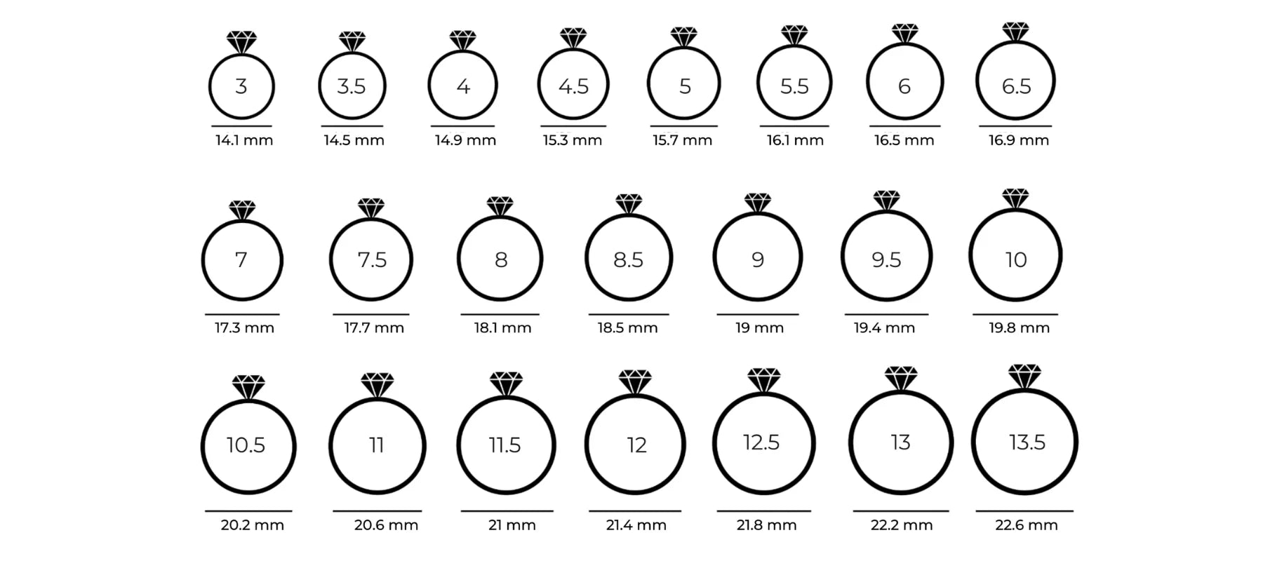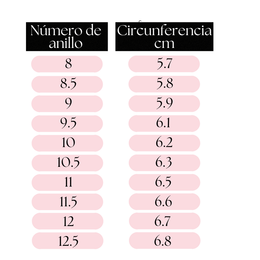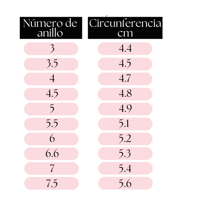 2.Mide el diámetro interior de tu anillo en mm y ubica la medida en la tabla de abajo para conocer tu número. Si la medida se encuentra entre dos tallas, elige la mayor.